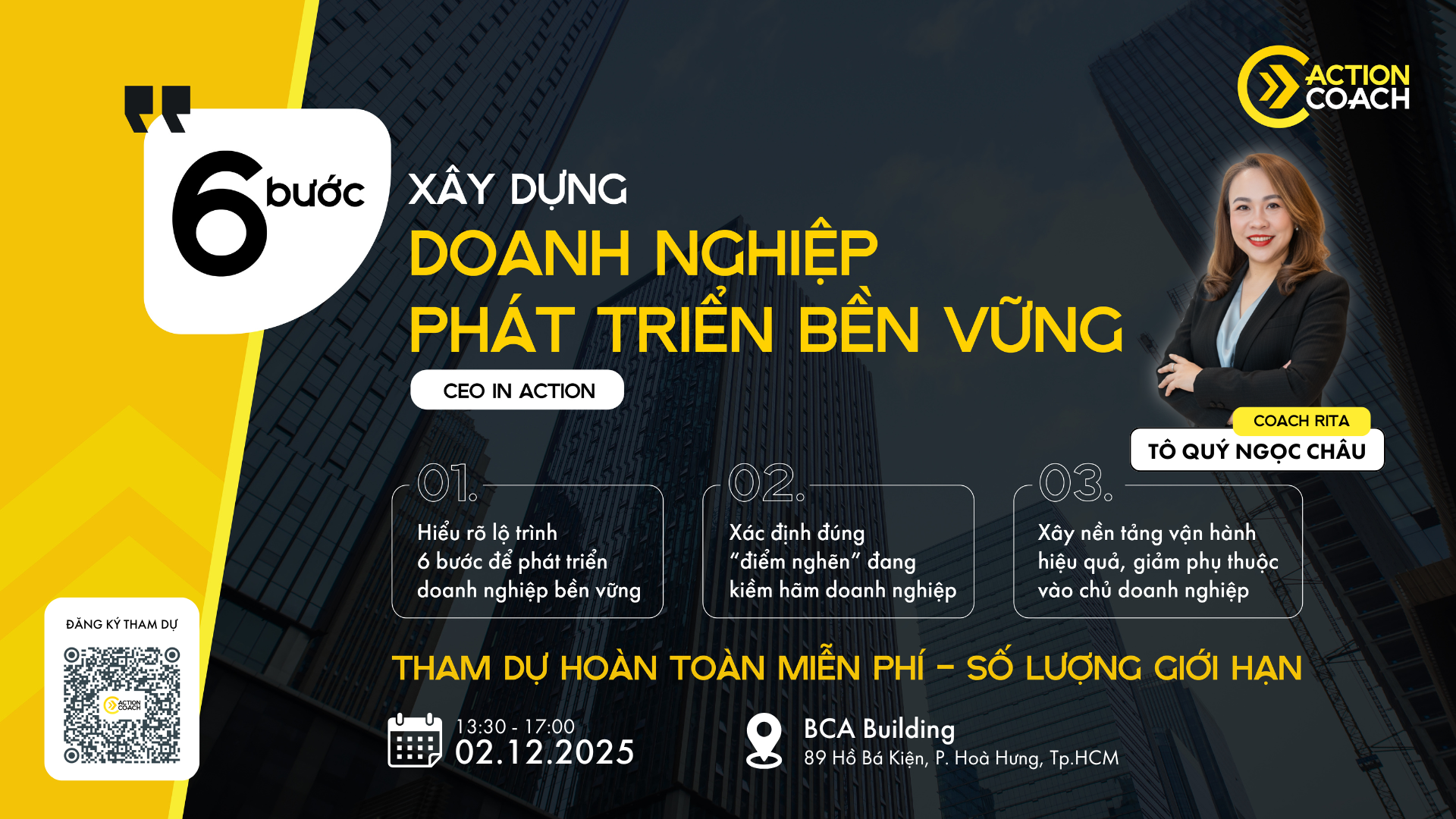 Trong bối cảnh doanh nghiệp Việt đang chịu áp lực cạnh tranh ngày càng lớn, việc vận hành dựa vào cảm tính khiến nhiều chủ doanh nghiệp rơi vào “vòng xoáy chữa cháy” mỗi ngày. Hiểu được thách thức đó, ActionCOACH Việt Nam tổ chức Workshop: 6 bước xây dựng doanh nghiệp phát triển bền vững, một chương trình đào tạo chuyên sâu giúp doanh nghiệp tái cấu trúc từ chiến lược đến vận hành.